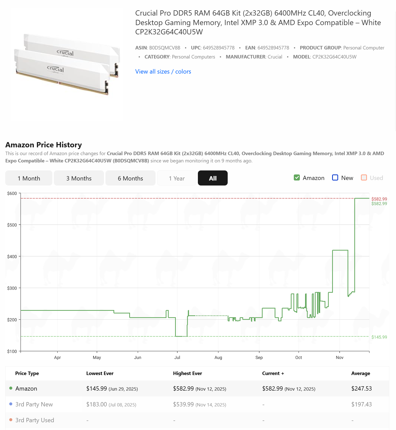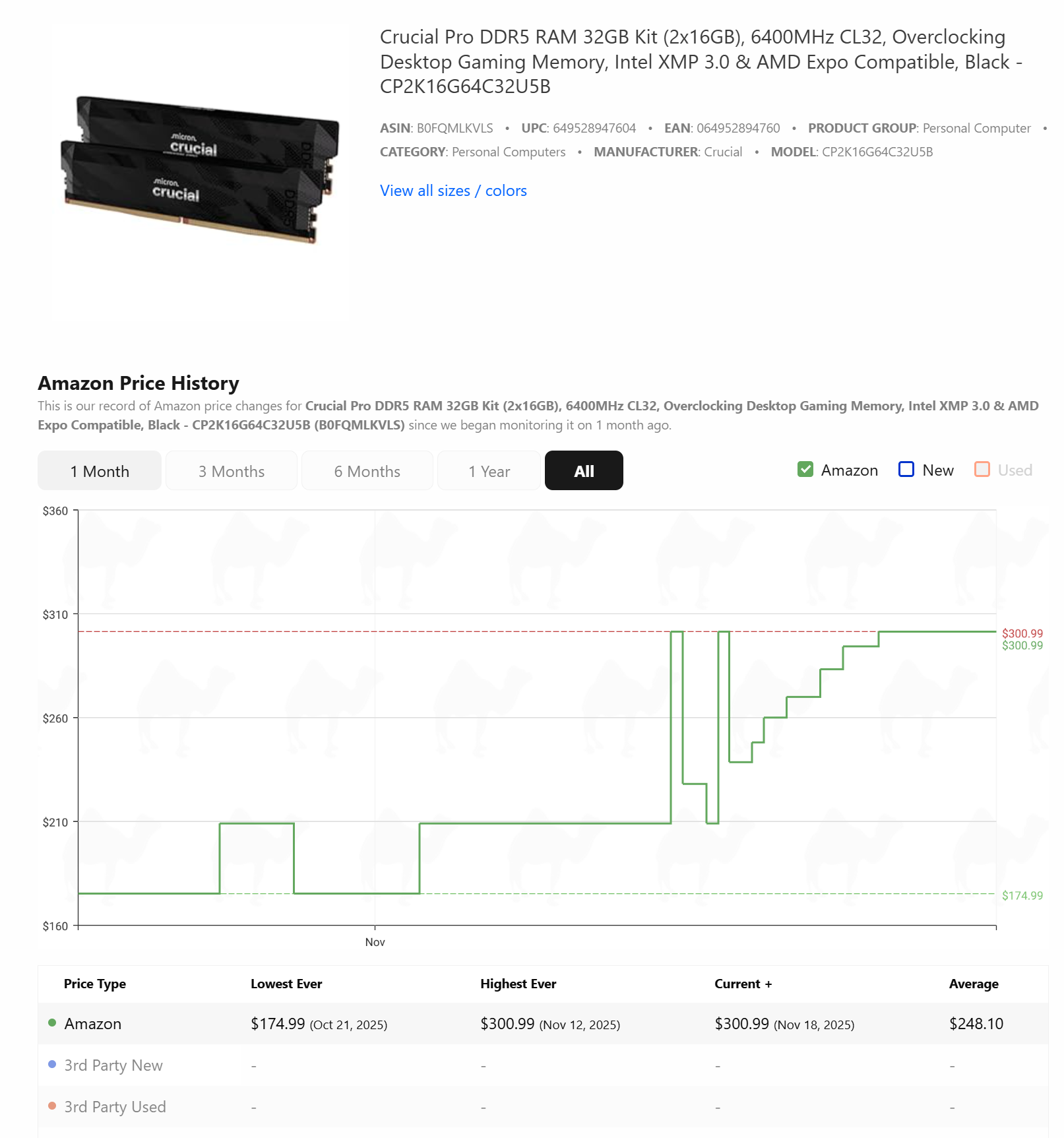 Big corporate AI plays also have an adverse affect on the consumer market too, y'know. Let's take a look at some memory pricing. Do note that as of the writing of this article, this data was taken the week before Black Friday.
